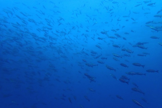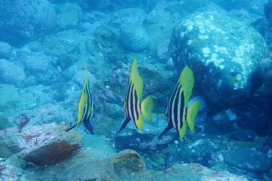 タカベの群れ、イサキの群れ、ワラサ、テングダイの群れ、カゴカキダイ、イシガキダイ、シラコダイ、ハコフグほか
