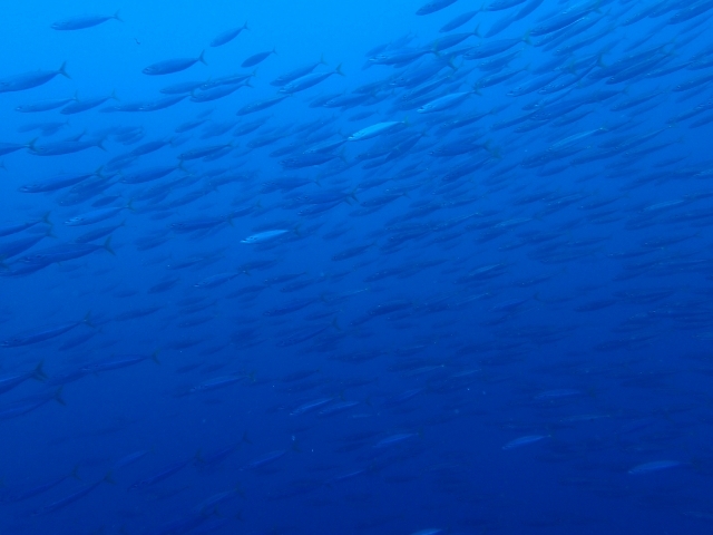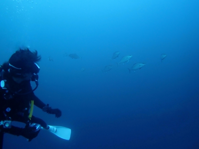 ヒレナガカンパチの群れが、ちょろちょろとついてきて遊んでくれるので思わず…