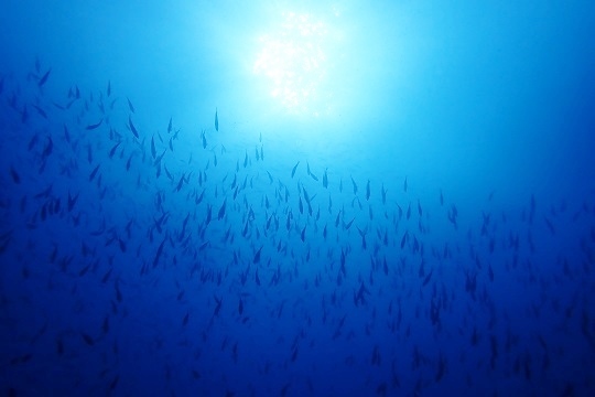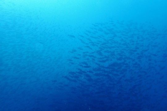 タカベの群れとイサキの群れのかたまりが